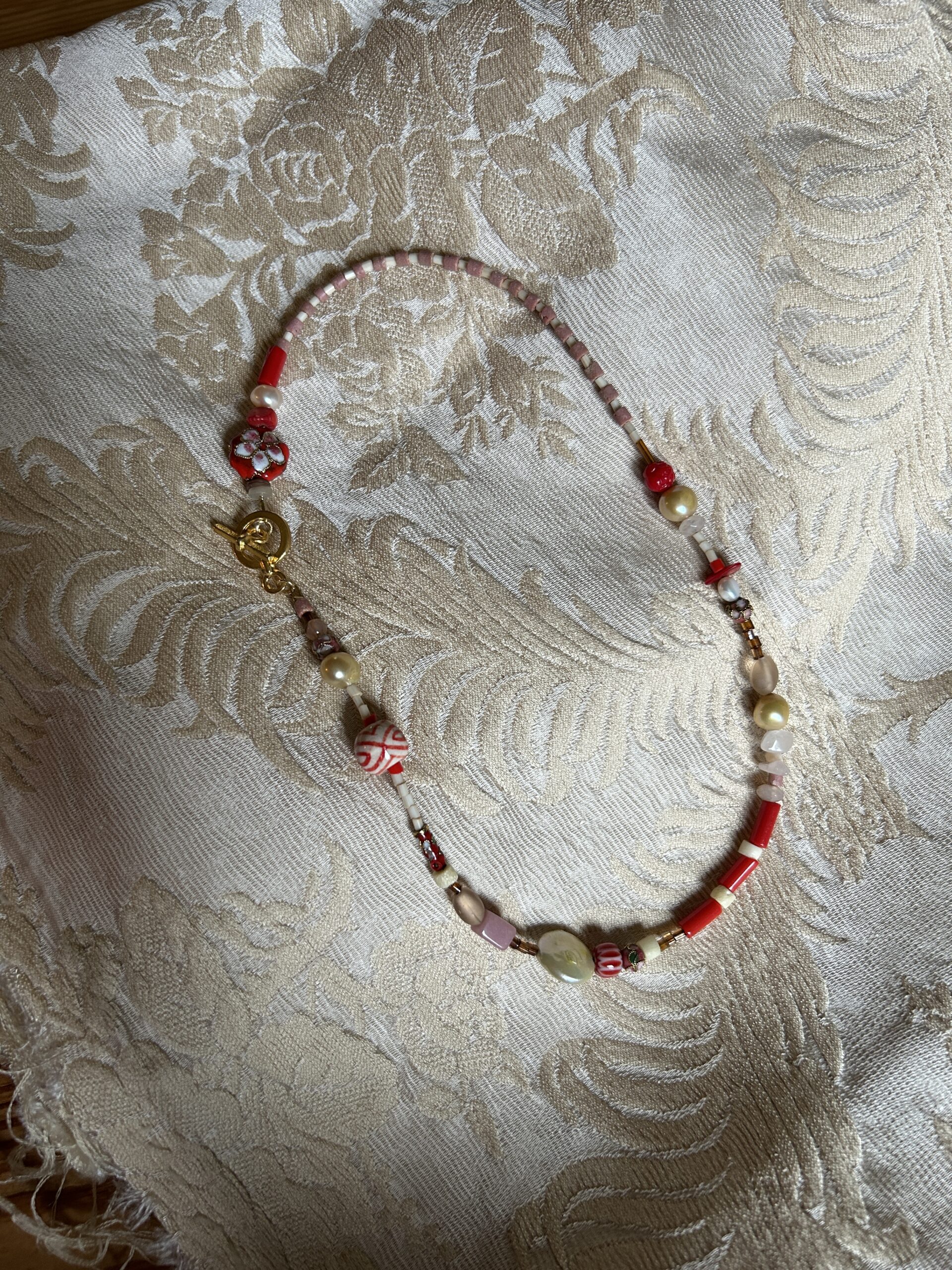 The beads for this necklace were sourced mainly in France and Morocco. In the souk alleyways, I searched for the most unique, red colored beads. Some of them more being than 80 years old ones that moved countries before ending up in the smallest beadshops in the smallest towns.
