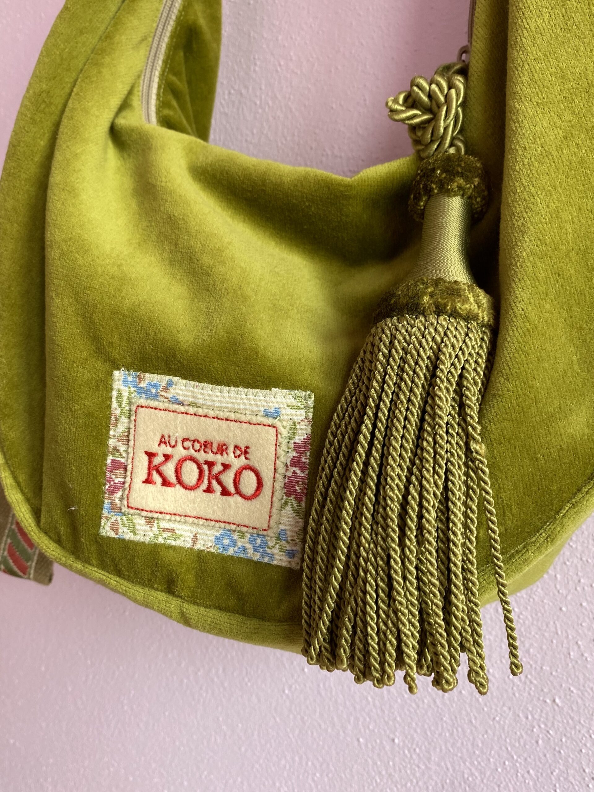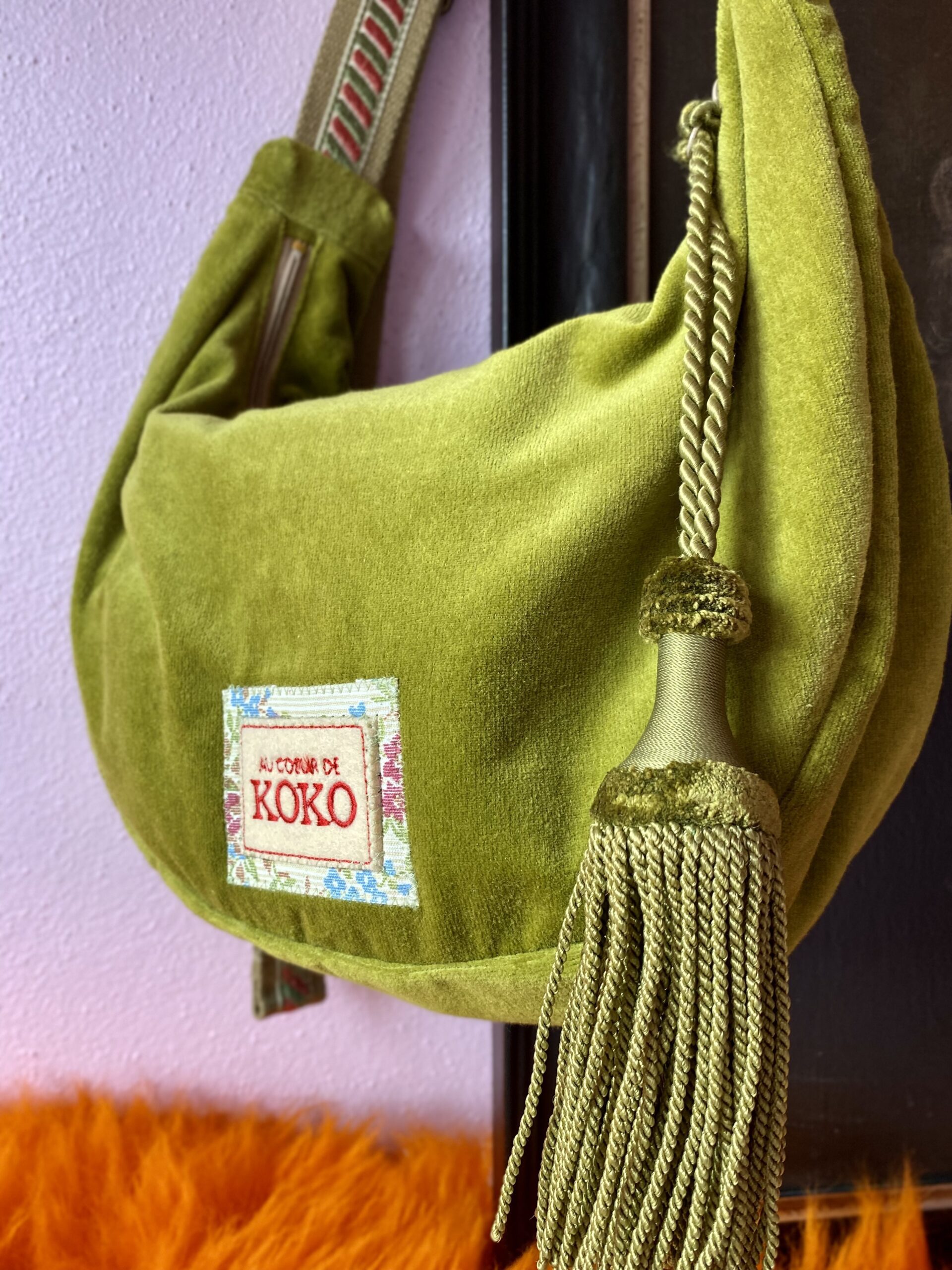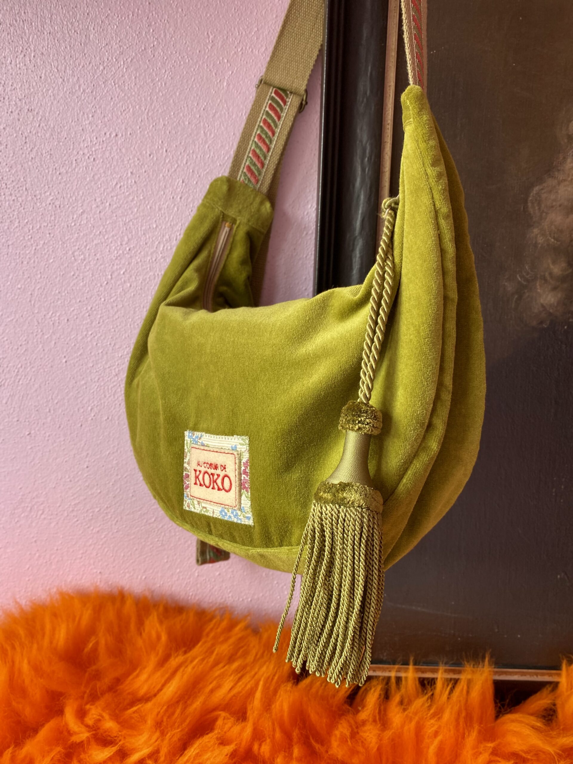 Een heel fijne en compacte schoudertas van groen velours, afkomstig van een groot gordijn. De binnenkant is gevoerd met een vintage katoenen stof met bloemen en heeft een binnenvakje met rits in dezelfde stof. De tas is voorzien van een stevige buitenrits waar een antieke gordijnkwast in dezelfde kleur aan hangt ter decoratie, maar deze kan er ook af worden gehaald.