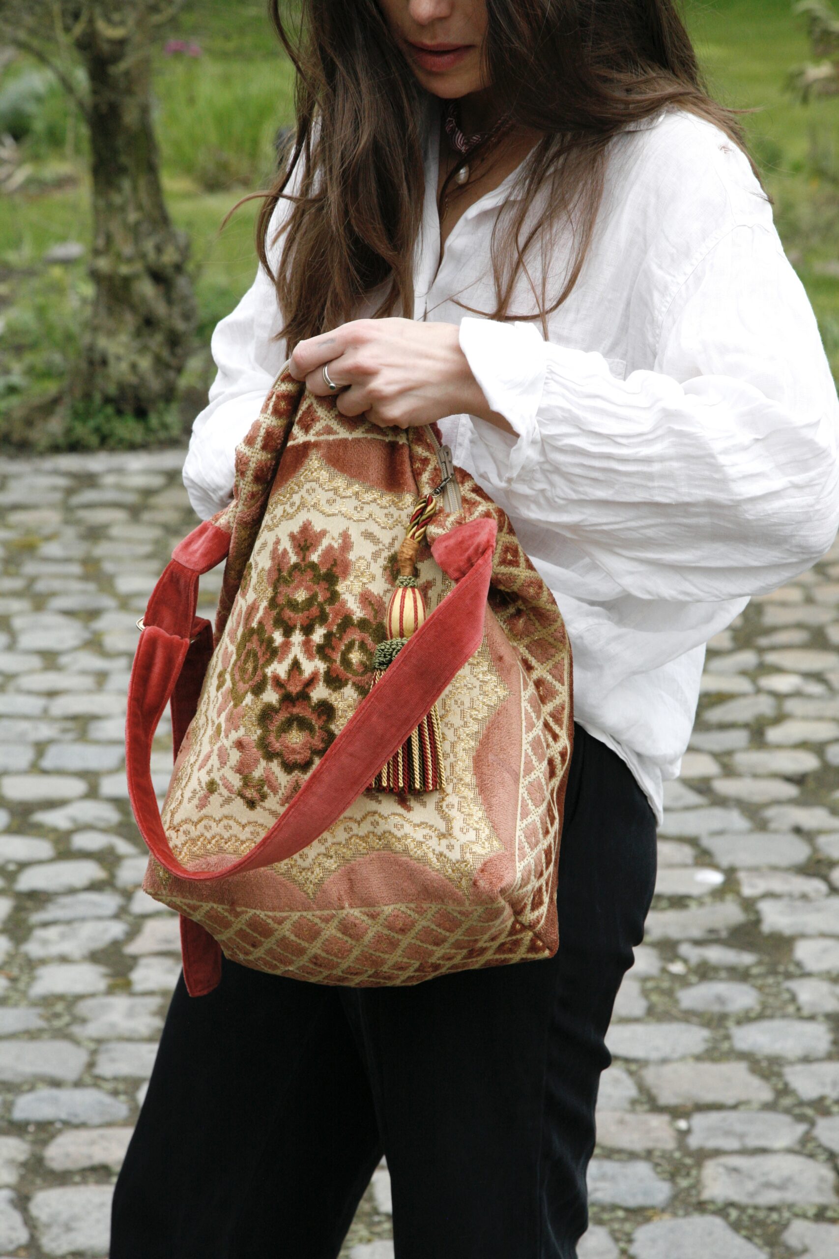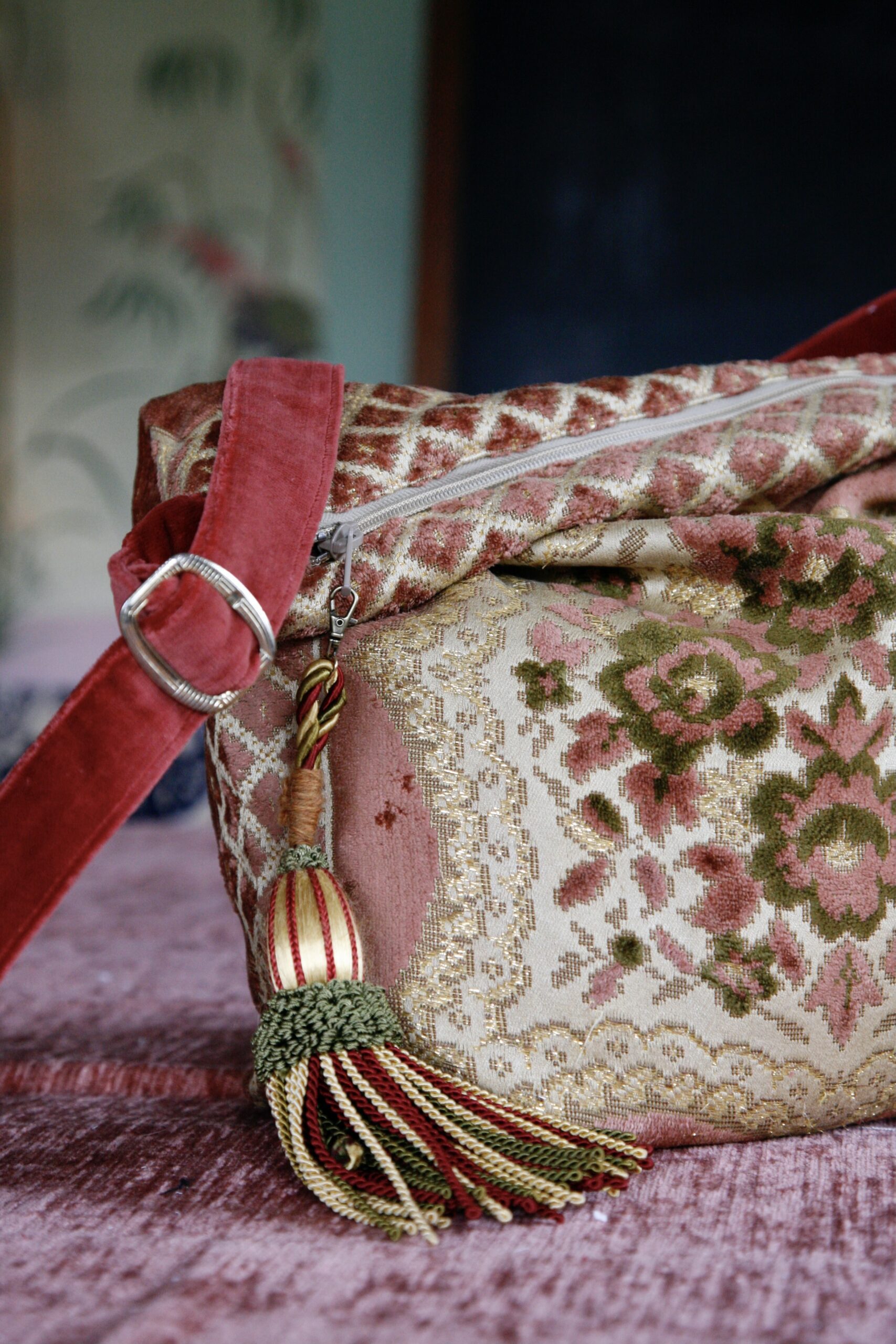 Een prachtig mooie tas van antieke gebloemde meubelstof met velours, in de kleuren oudroze, goud en groen. Het hengsel is gemaakt van een donkerrode zachte velours en is verstelbaar tot 98 centimeter, dus zowel kort als lang te dragen. Volledig gevoerd met rib velours en heeft een binnenvakje! Buiten sluit je de tas met een rits met een vintage embrasse.