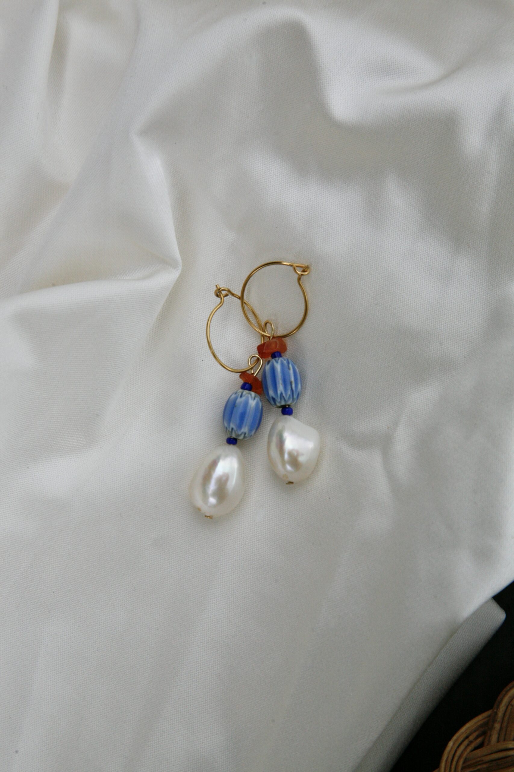 Gemaakt met lichtblauwe millefiori kralen, zoetwaterparels, carneool natuursteentjes en rvs stainless steel oorbellen.