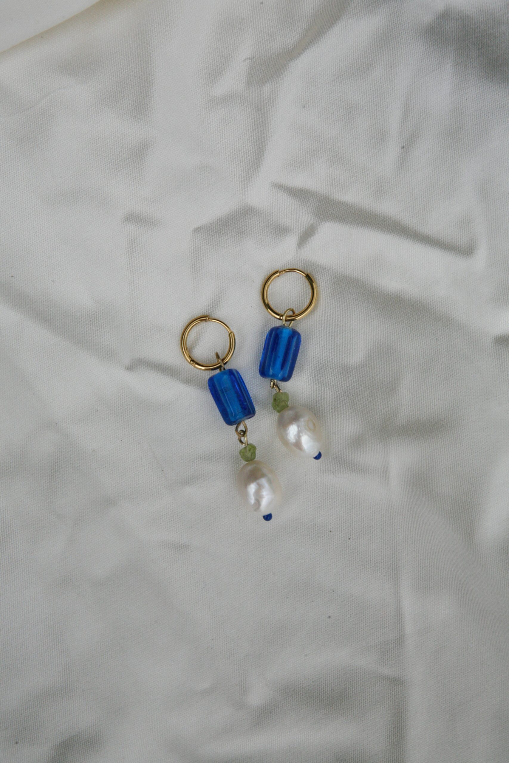 Gemaakt met zoetwaterparels, peridot natuursteentjes, blauwe glaskralen en rvs stainless steel oorbellen. De hangers hebben een lengte van 50mm.