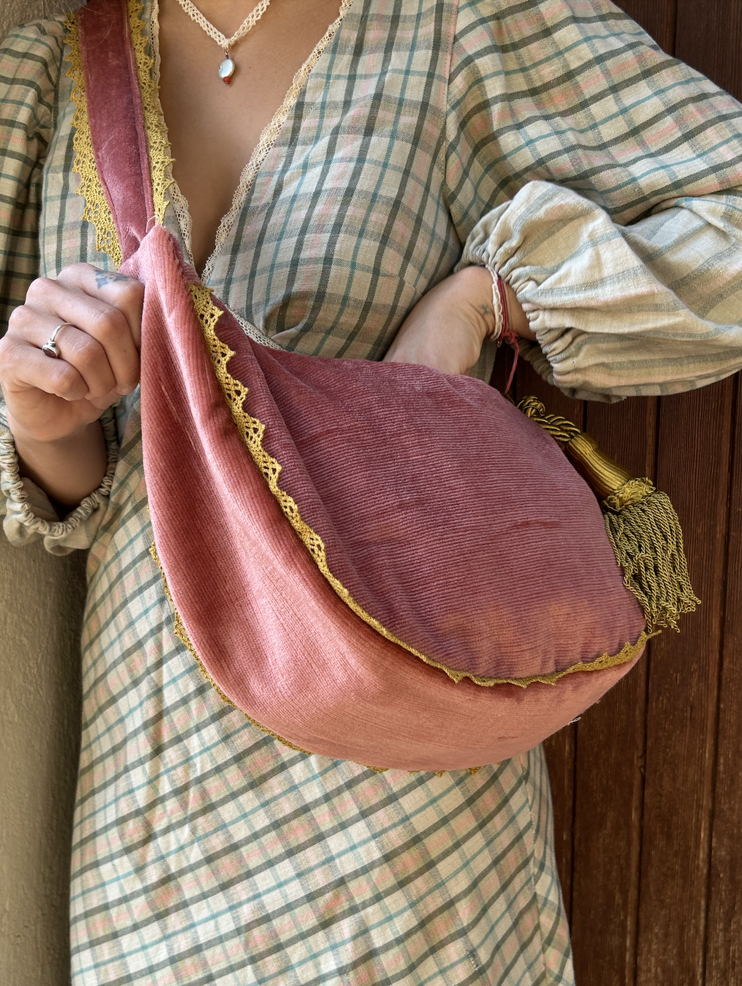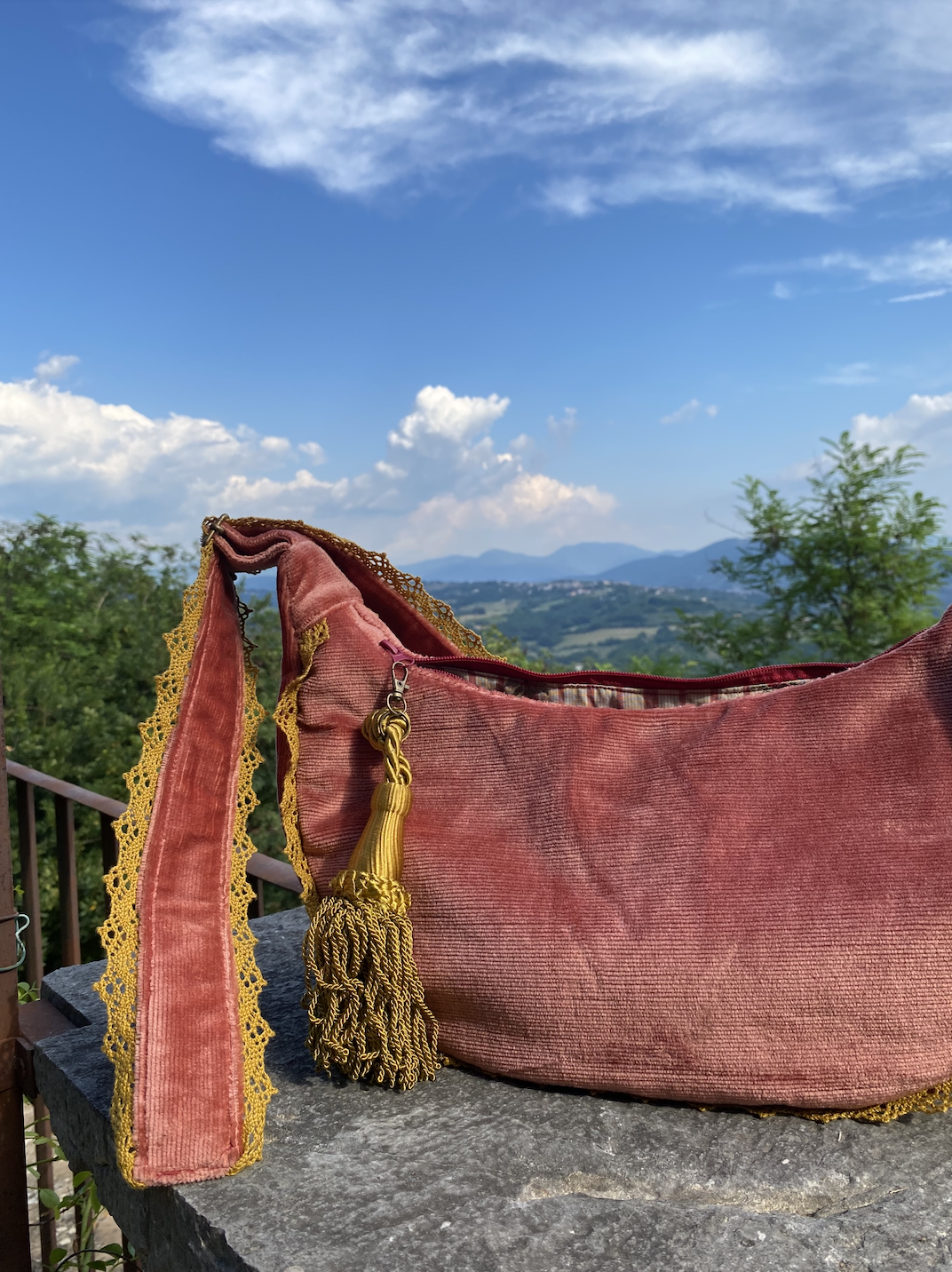 The next Ellie arrived! It is once again a very comfortable and yet a compact shoulder bag made of an antique rose velvet curtain and has mustard colored lace trim on the sides and strap. The sides and shoulder strap are made of the same rose velvet fabric. You’ll find an inside pocket with zipper to secure your belongings, and the outside also has a zipper that has a matching golden tassel enclosed. The strap is adjustable up to 98 cm. I made this bag during my stay in a small town in the middle of Italy, while enjoying good food, a beautiful garden, lots of sun and having no distractions. I hope you will enjoy wearing it.