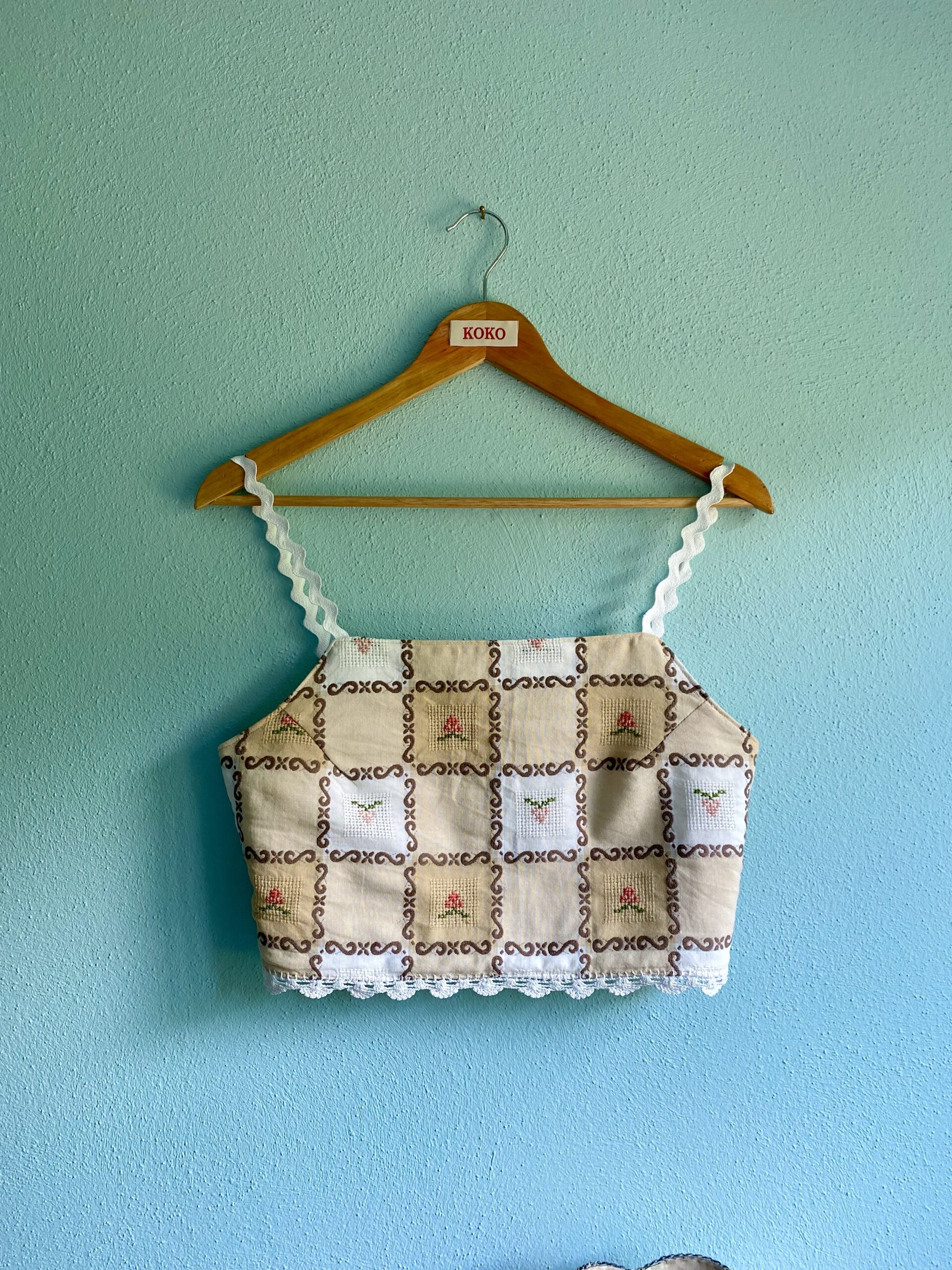 De ultieme zomertop gemaakt van tweedehands geborduurd tafelkleedje uit Chania (Kreta), afgewerkt met zigzagband als schouderbandjes en achterop als trekkoord. Maat S, uitrekbaar tot maat M.