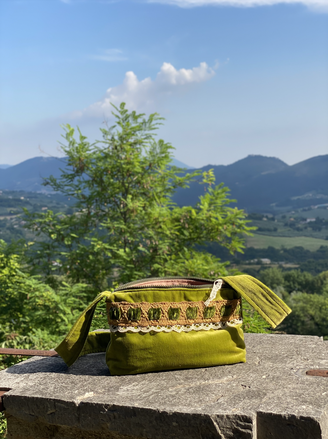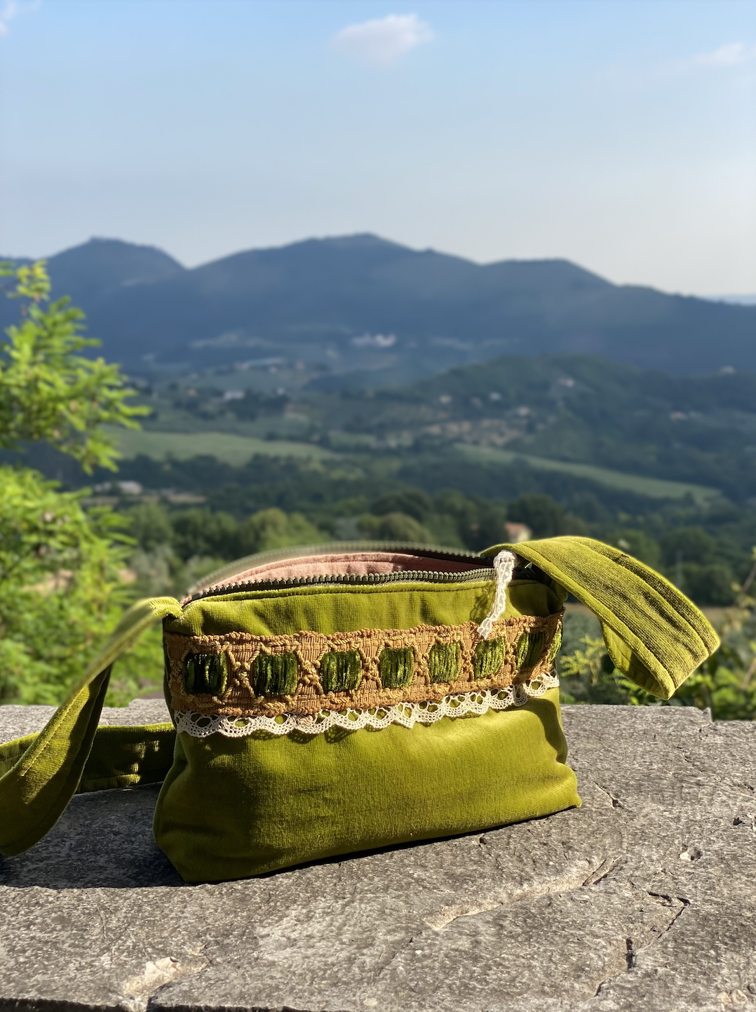 This petit bag is made from the most perfect and softest green cotton velvet fabric and a soft pink cotton lining fabric. On the front you find antique velvet trim and scallop cotton lace. Although the bag looks rather small, it is in fact quite spacious and fits a most necessary small water bottle during hot summer days. There is a small open pocket in the interior and the bag closes with a zipper. The strap is 99 cm.