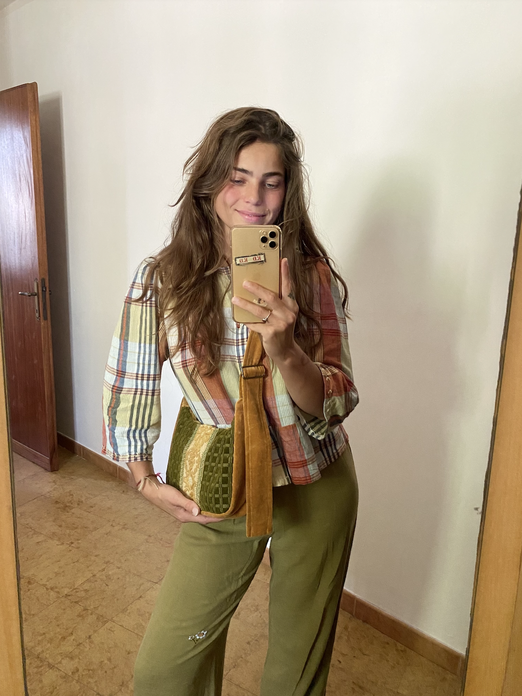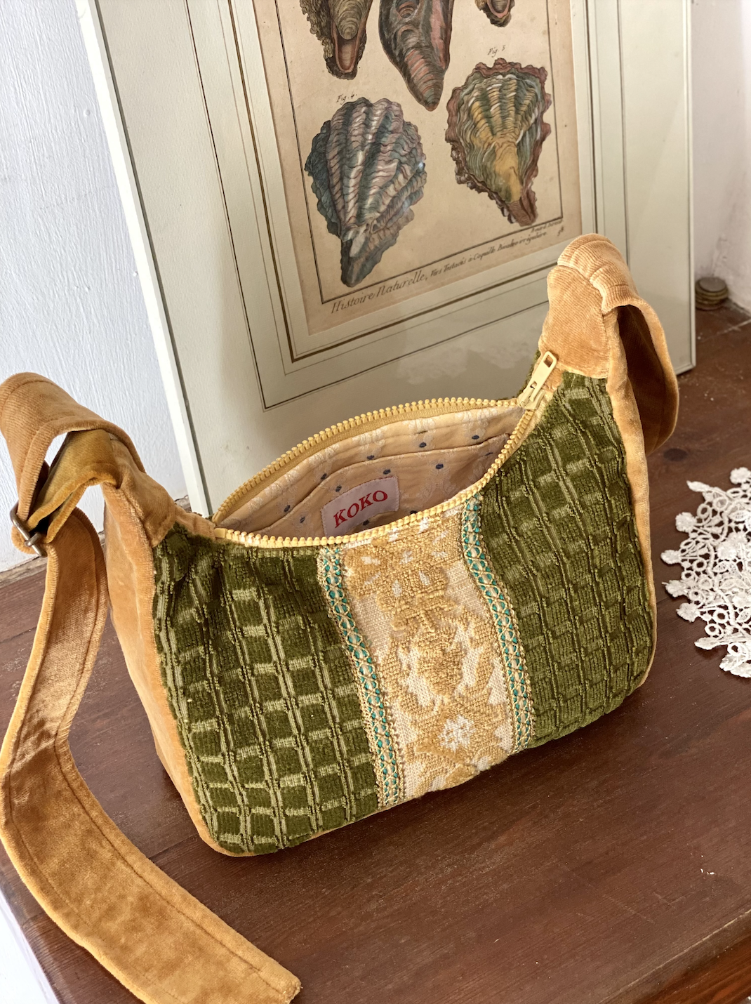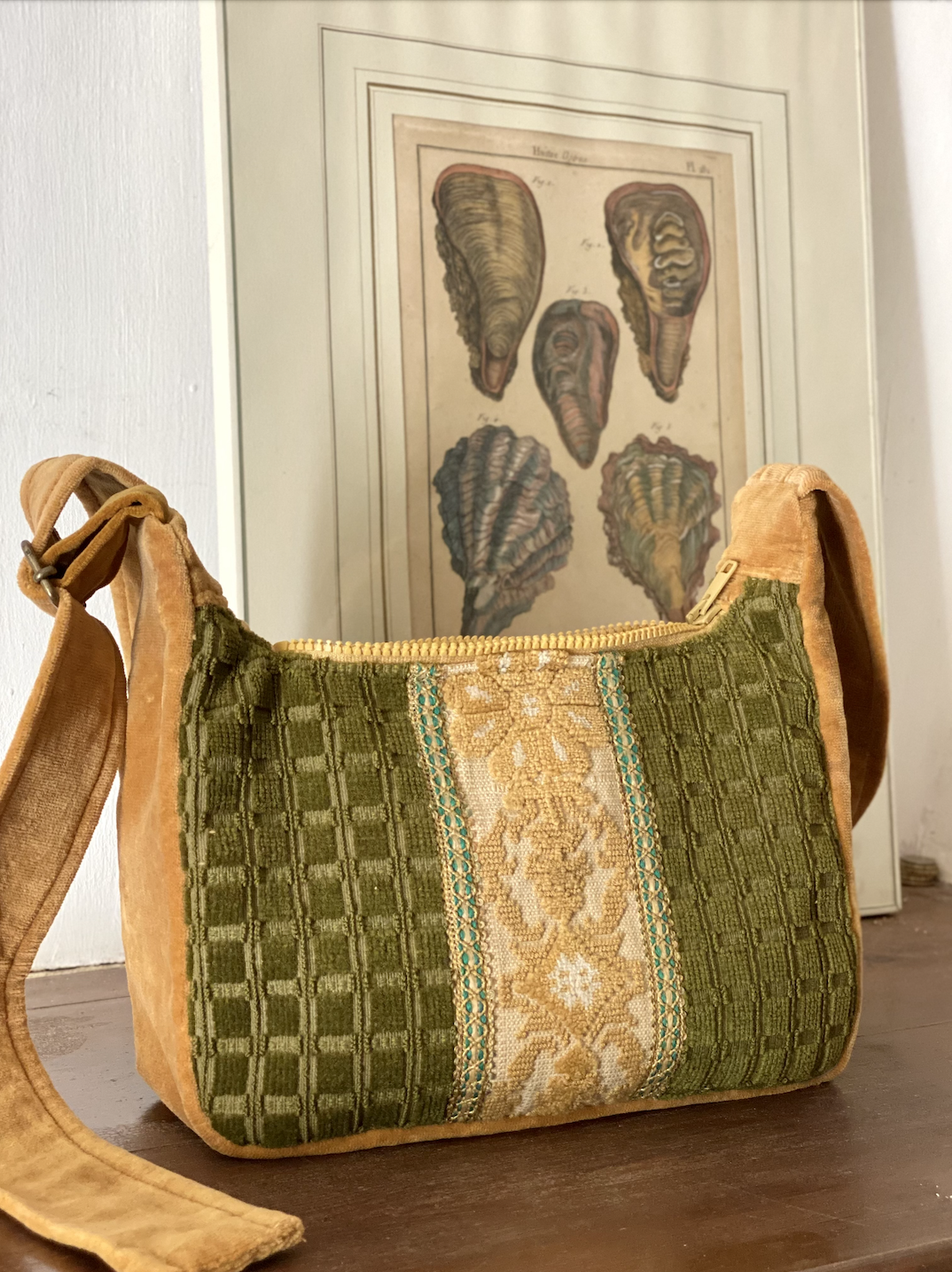 This Mini Bag is made of vintage fabrics that were sourced in Italy and Spain, such as a tablerunner and ochre velvet fabric. On the front, decorative trim is added. It is a small bag, but fits a bottle of water so it would be a perfect city bag on a hot summer day!