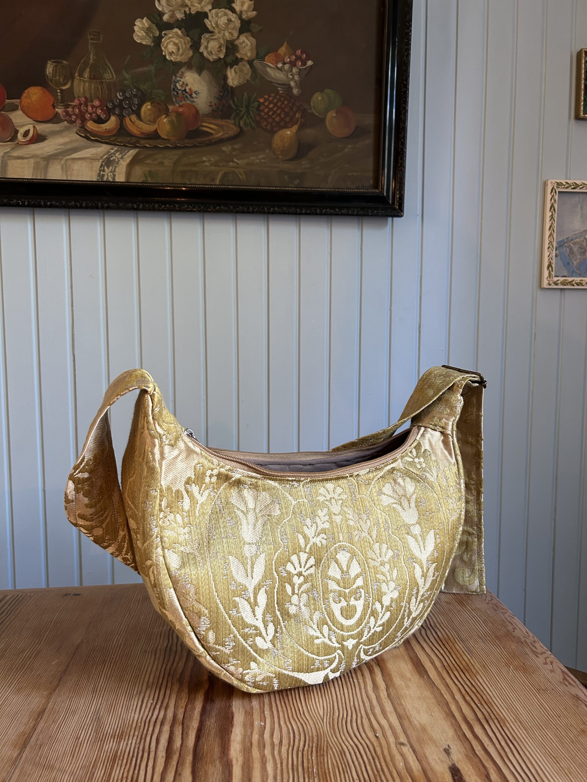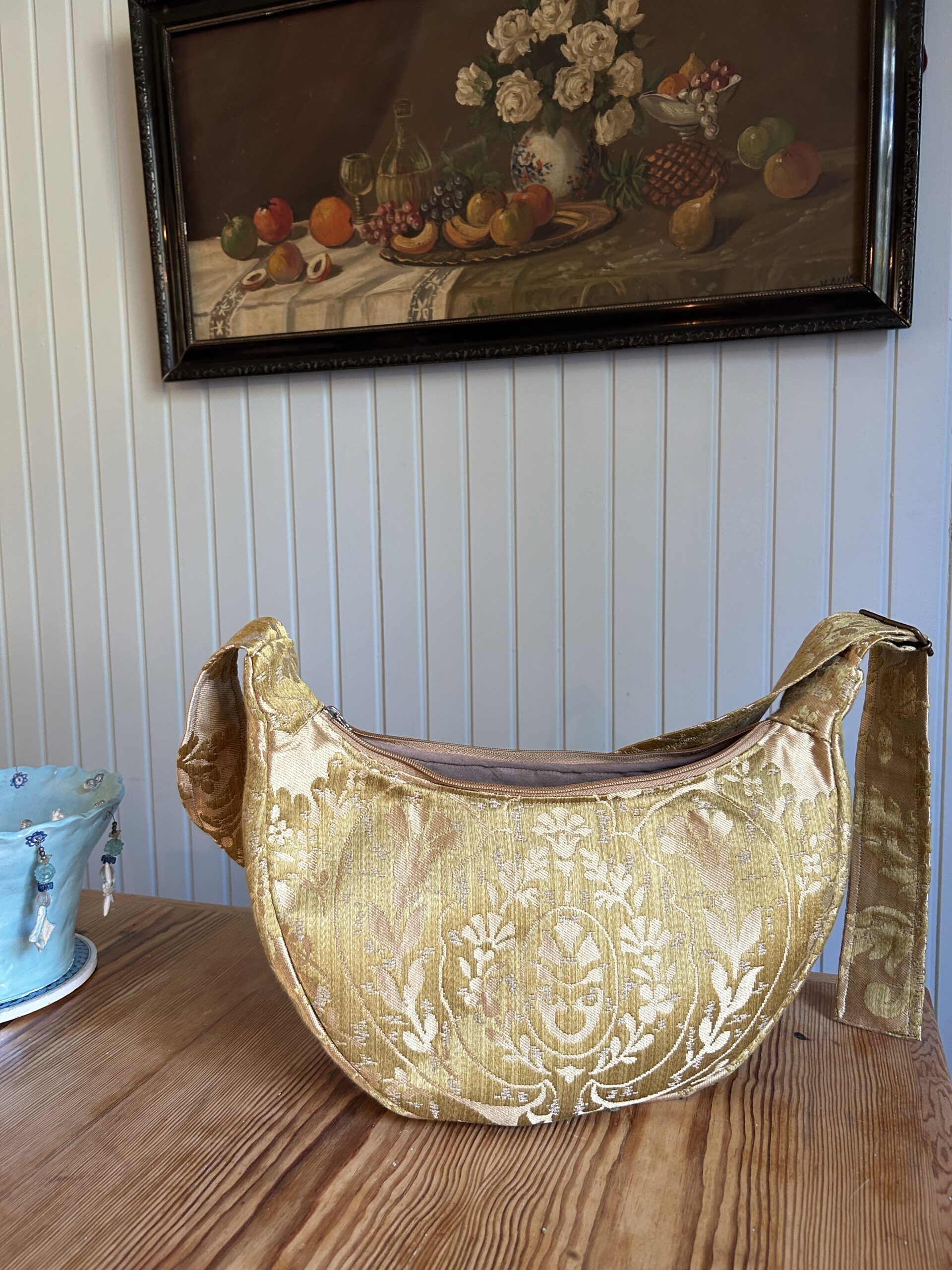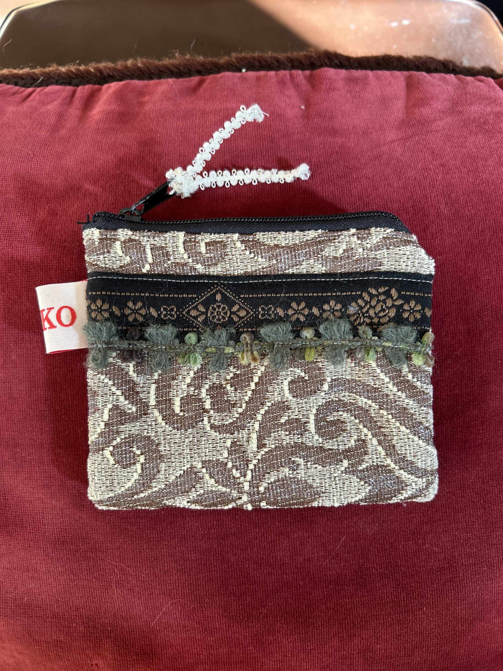 A perfect small sized pouch to hold your essentials. Made with vintage and antique fabrics & trims, and fully lined. Closes with a zipper.