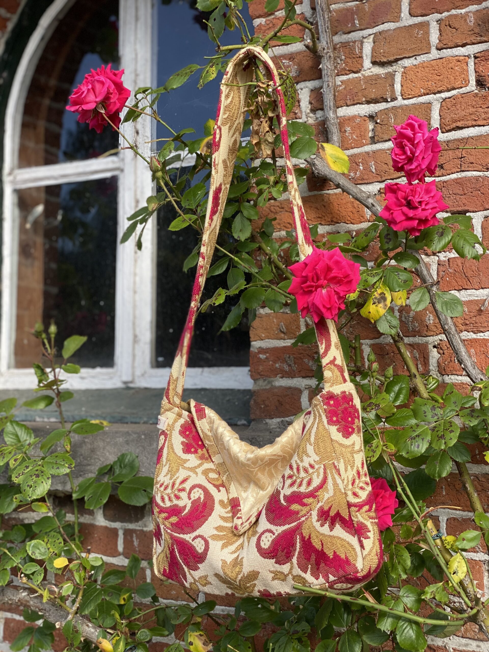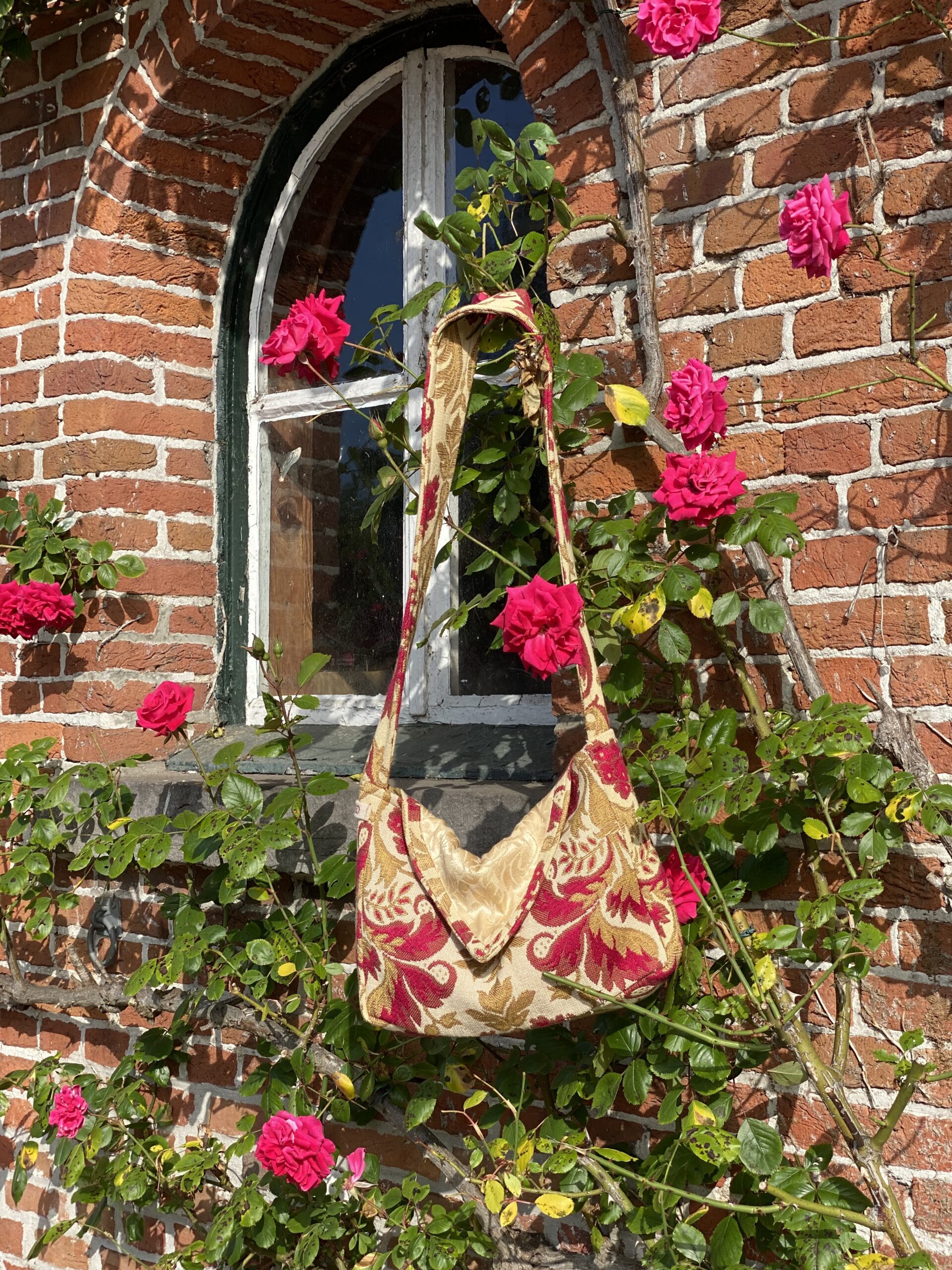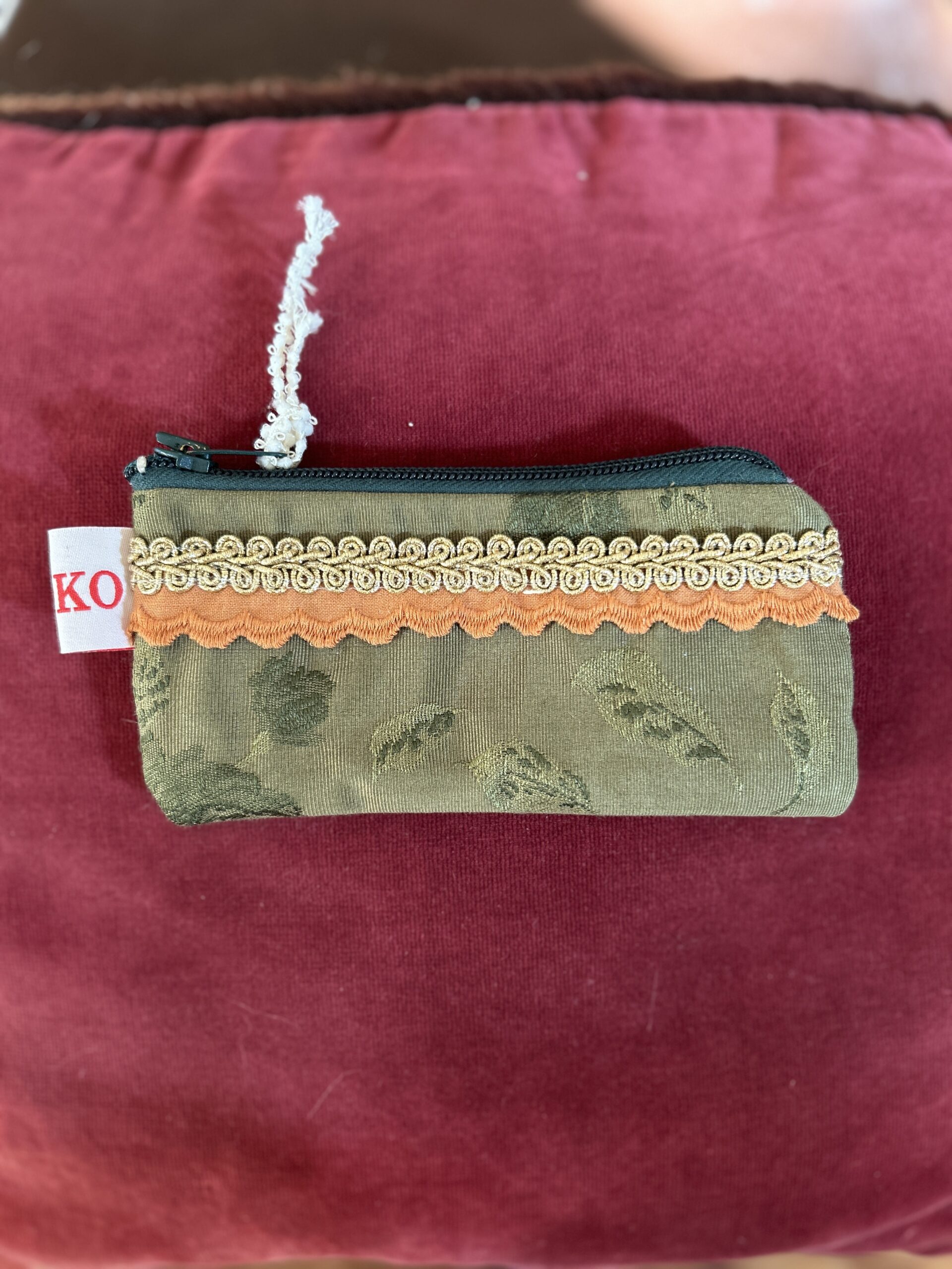 A perfect small sized pouch to hold your essentials. Made with vintage and antique fabrics & trims, and fully lined. Closes with a zipper.