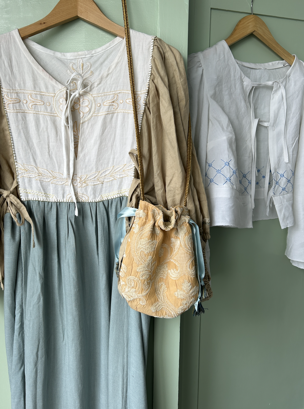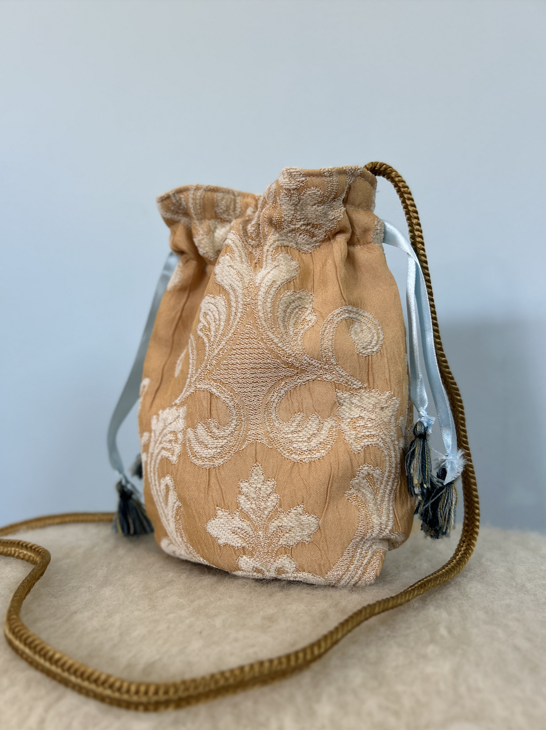 The Carlita Bag is a small bag of 18 x 25 cm and is perfect for going out and about without taking all kinds of unnecessary things. The exterior is made of butter yellow, jacquard fabric sourced in Morocco, and is fully lined with a cotton fabric. The size fits a phone up to 17 cm (like an iPhone Plus). It closes with drawstring with satin straps and snap button. The strap is made of twisted cord and 115 cm in length.