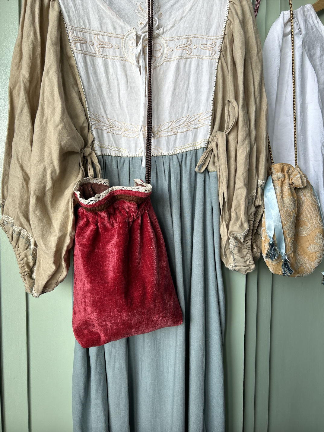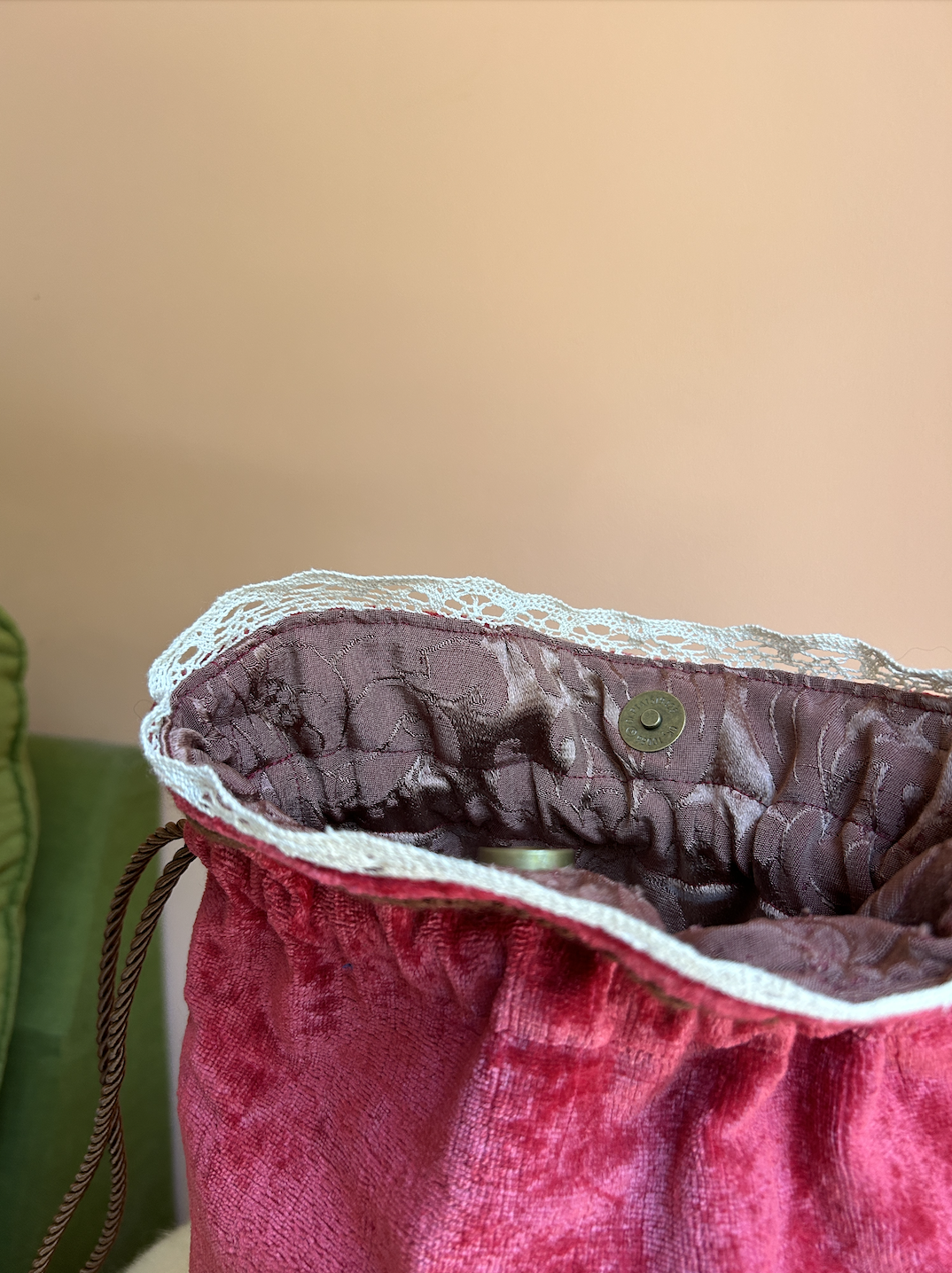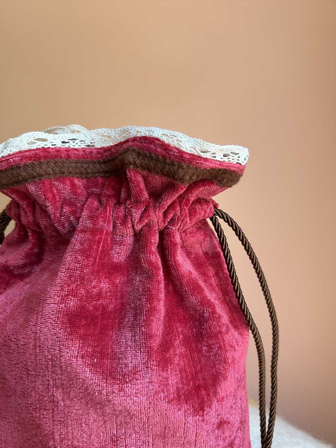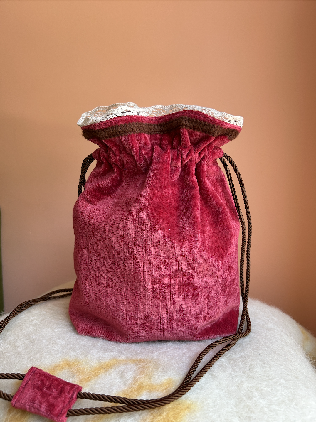 A new bag has arrived! The Imane is a bucket bag with drawstrings made of vintage fabrics. It’s spacious, mid-sized and easy to wear. The exterior is made of a crushed red velvet fabric, antique lace and wool trim, and the interior is fully lined with brown vintage damask from Spain. The bag closes with a magnetic snap button, next to the long twisted cords on the sides that can be pulled to wish.