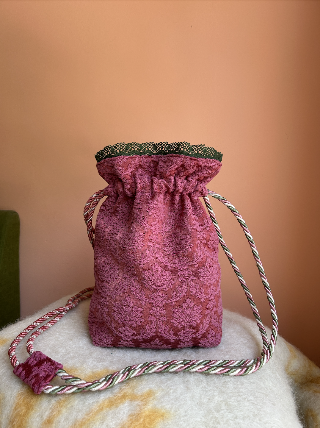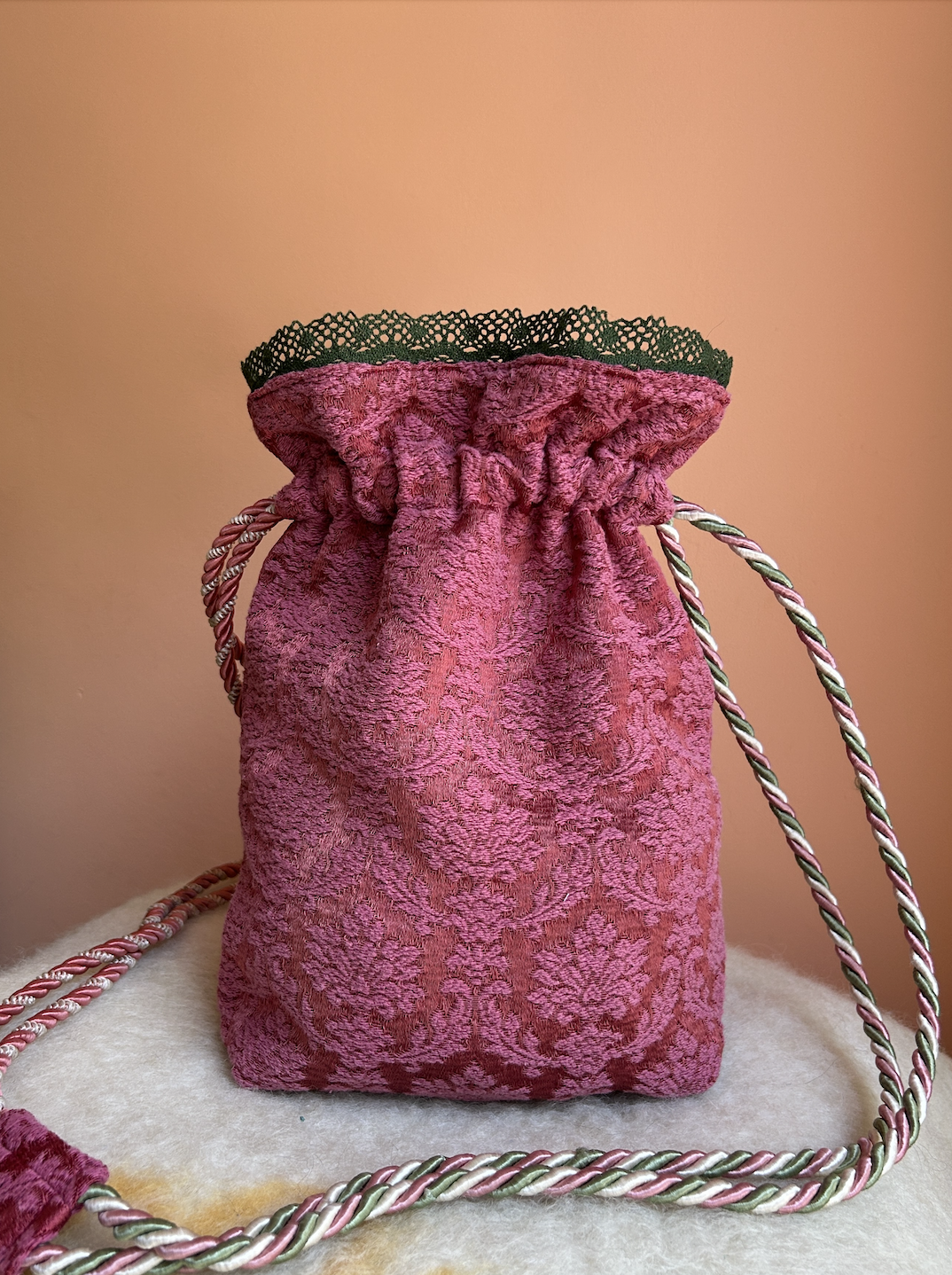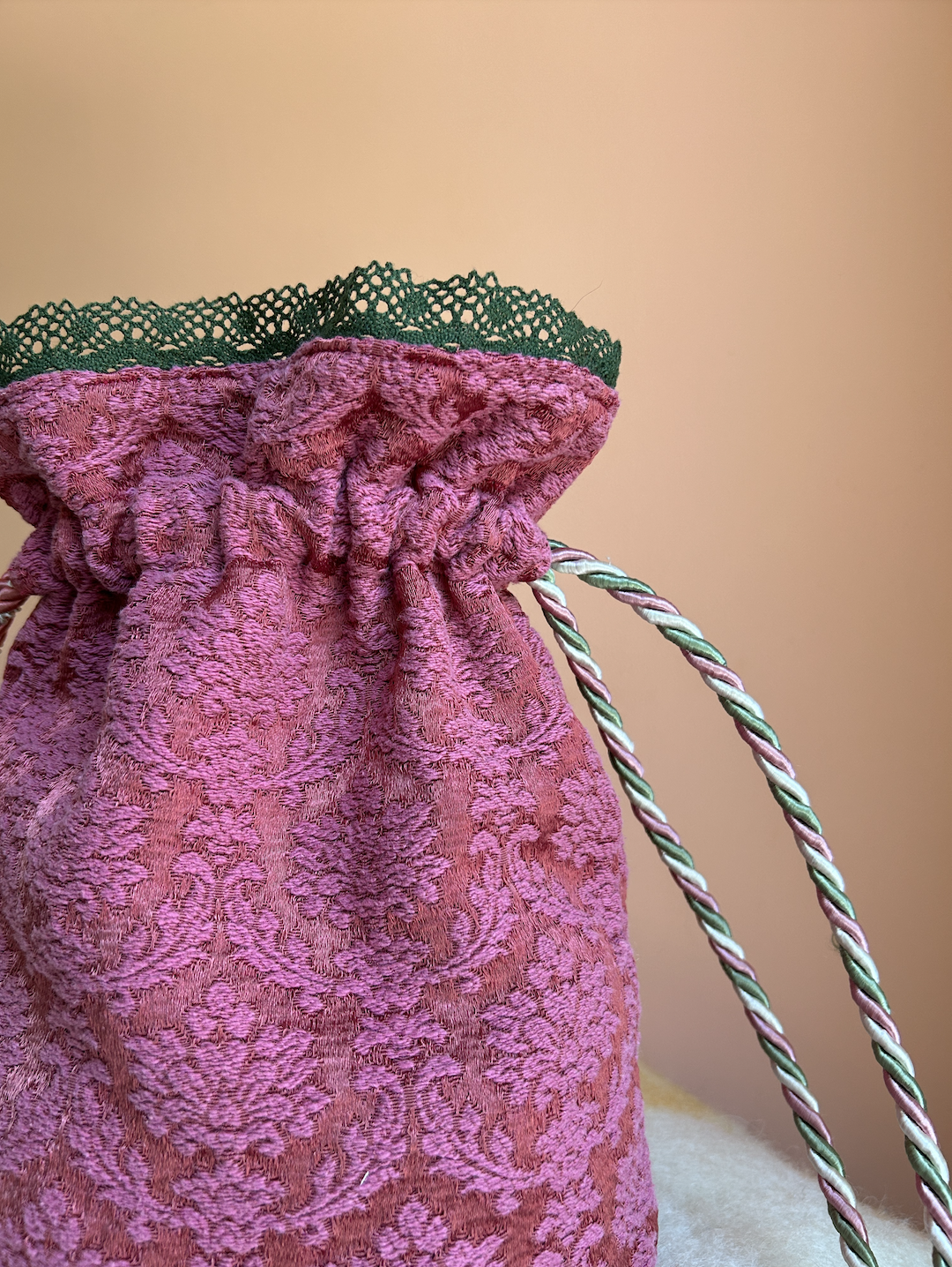 A new bag has arrived! The Imane is a bucket bag with drawstrings made of vintage fabrics. It’s spacious, mid-sized and easy to wear. The exterior is made of a pink jacquard fabric, dark green lace trim and the interior is fully lined with green-and-white striped viscose fabric. The bag closes with a magnetic snap button, next to the long twisted cords on the sides that can be pulled to wish.