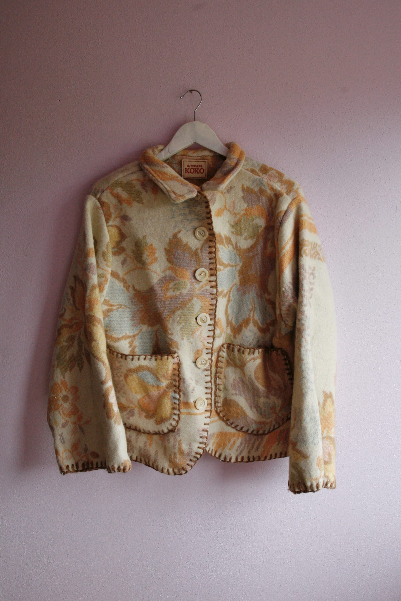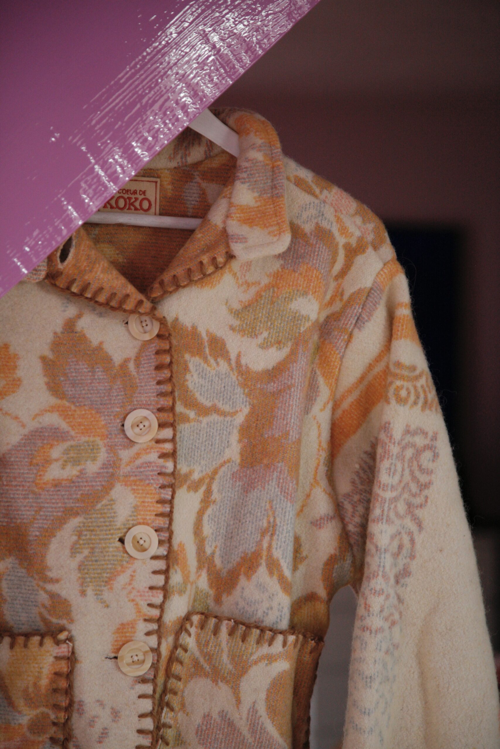 Dit is een wollen deken waar een jas van is gemaakt. Het is een groot model, waardoor hij oversized valt als je een kleine maat hebt als XS of S, en waarbij hij goed passend valt als je een maat M of L hebt. De jas is niet gevoerd, maar is voor elk seizoen geschikt omdat je het als jas of vestje kunt dragen. Verder zijn alle randen afgewerkt met een dekensteek van bruin wol. Echt een ontzettend fijne warm item in je kast.