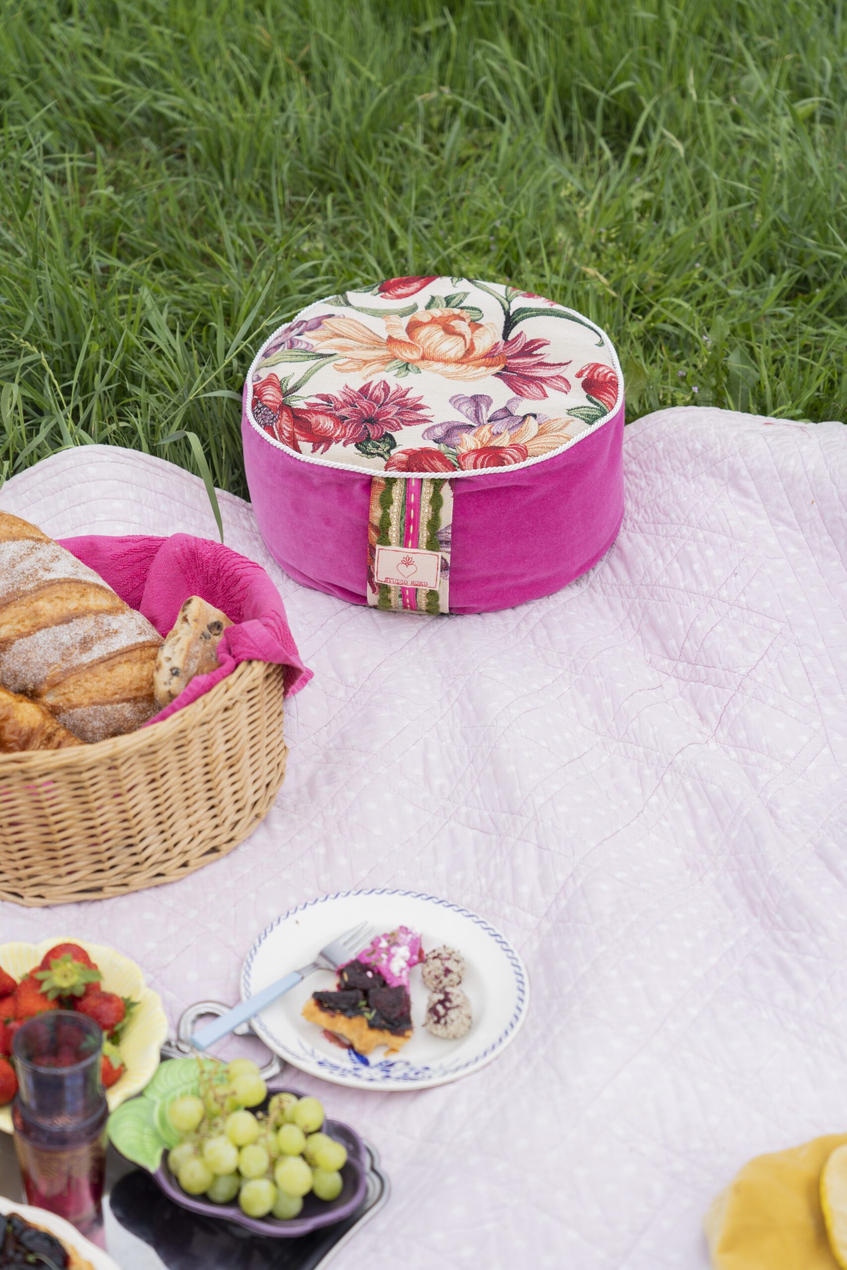 Het buitenmateriaal bestaat uit een zijkant van roze velours en een gebloemde stof bovenop, een handvat met rijke trims, afgewerkt met satijnen paspelband. De buitenhoes is dankzij ritssluiting afneembaar en wasbaar (op 30 graden), al is het raadzaam dit zo min mogelijk te doen en met een handwas. Het binnenmateriaal (de binnenhoes) bestaat uit 100% katoen en wordt gevuld met biologisch boekweitkaf uit Nederland.