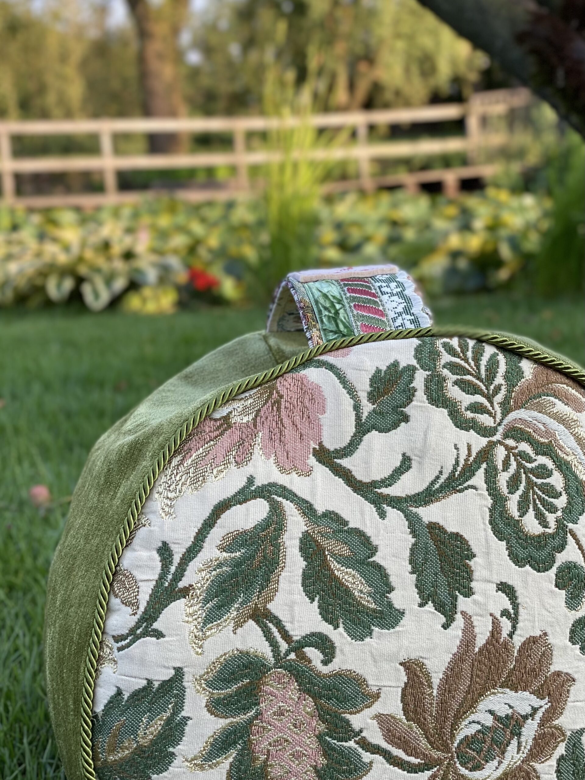 Het buitenmateriaal bestaat uit een vintage crèmekleurige stof met roze en taupe bloemen, een handvat met rijke trims, afgewerkt met satijnen paspelband. De buitenhoes is dankzij ritssluiting afneembaar en wasbaar (op 30 graden), al is het raadzaam dit zo min mogelijk te doen en met een handwas. Het binnenmateriaal (de binnenhoes) bestaat uit 100% katoen en wordt gevuld met biologisch boekweitkaf uit Nederland.