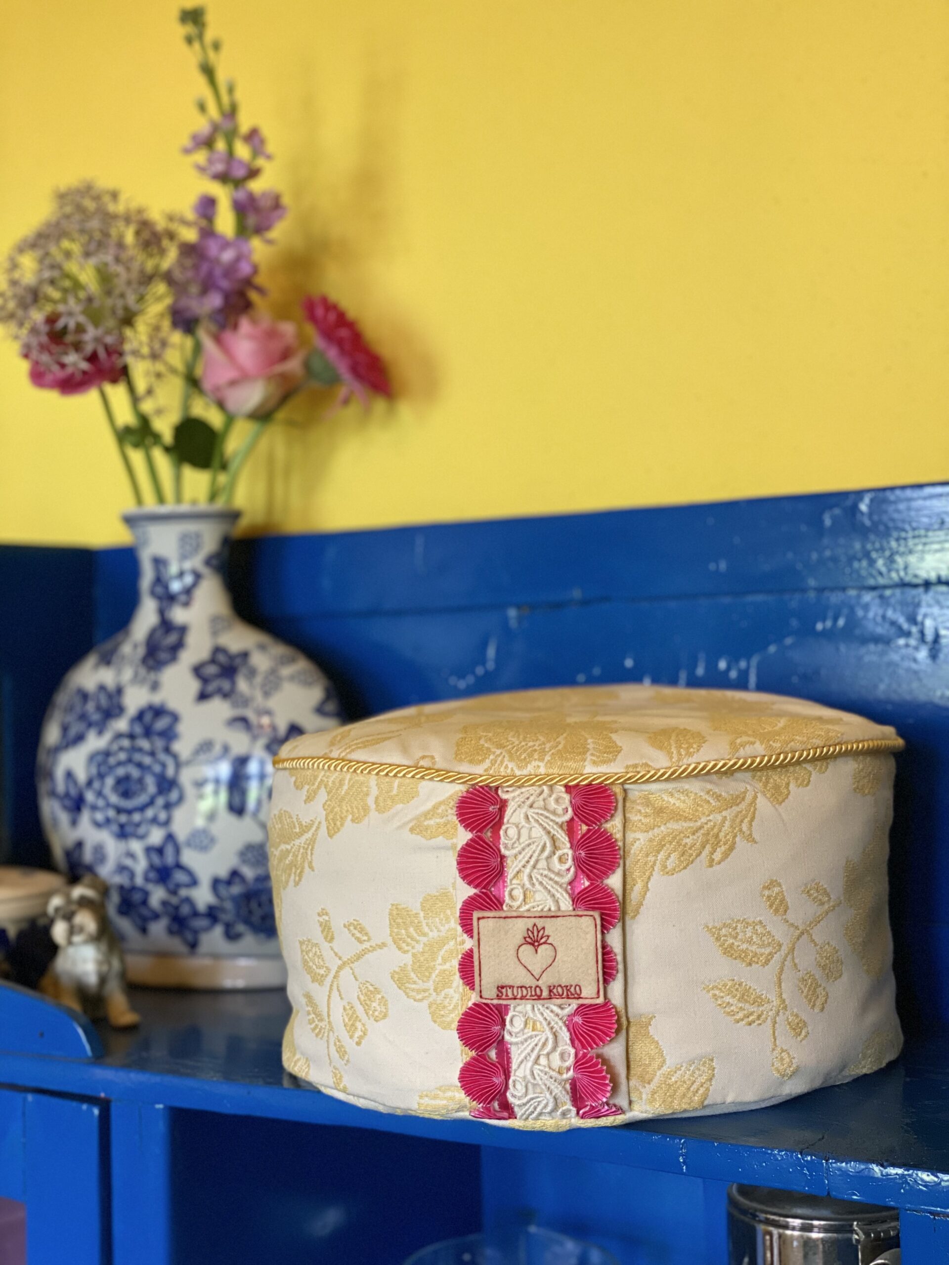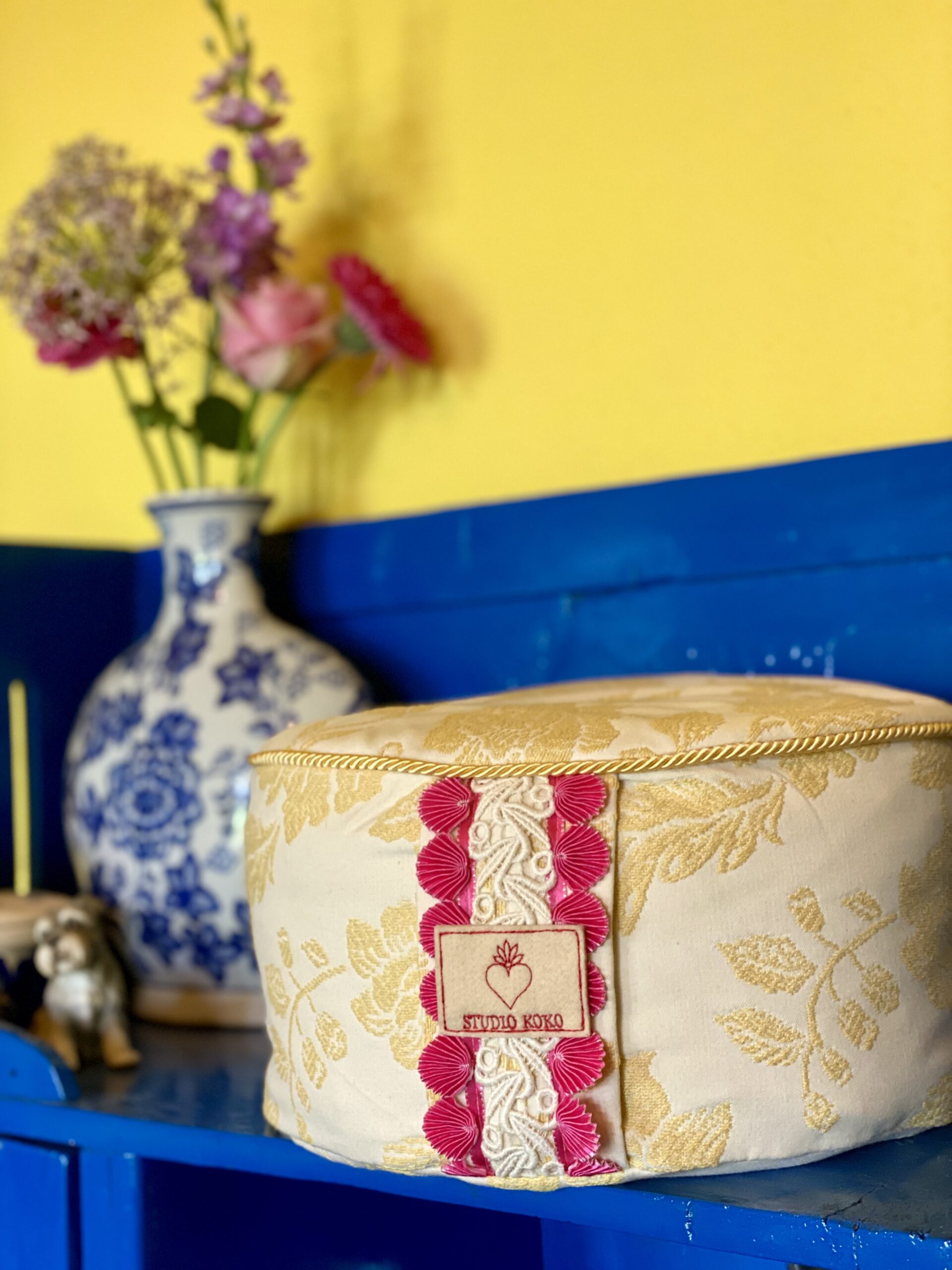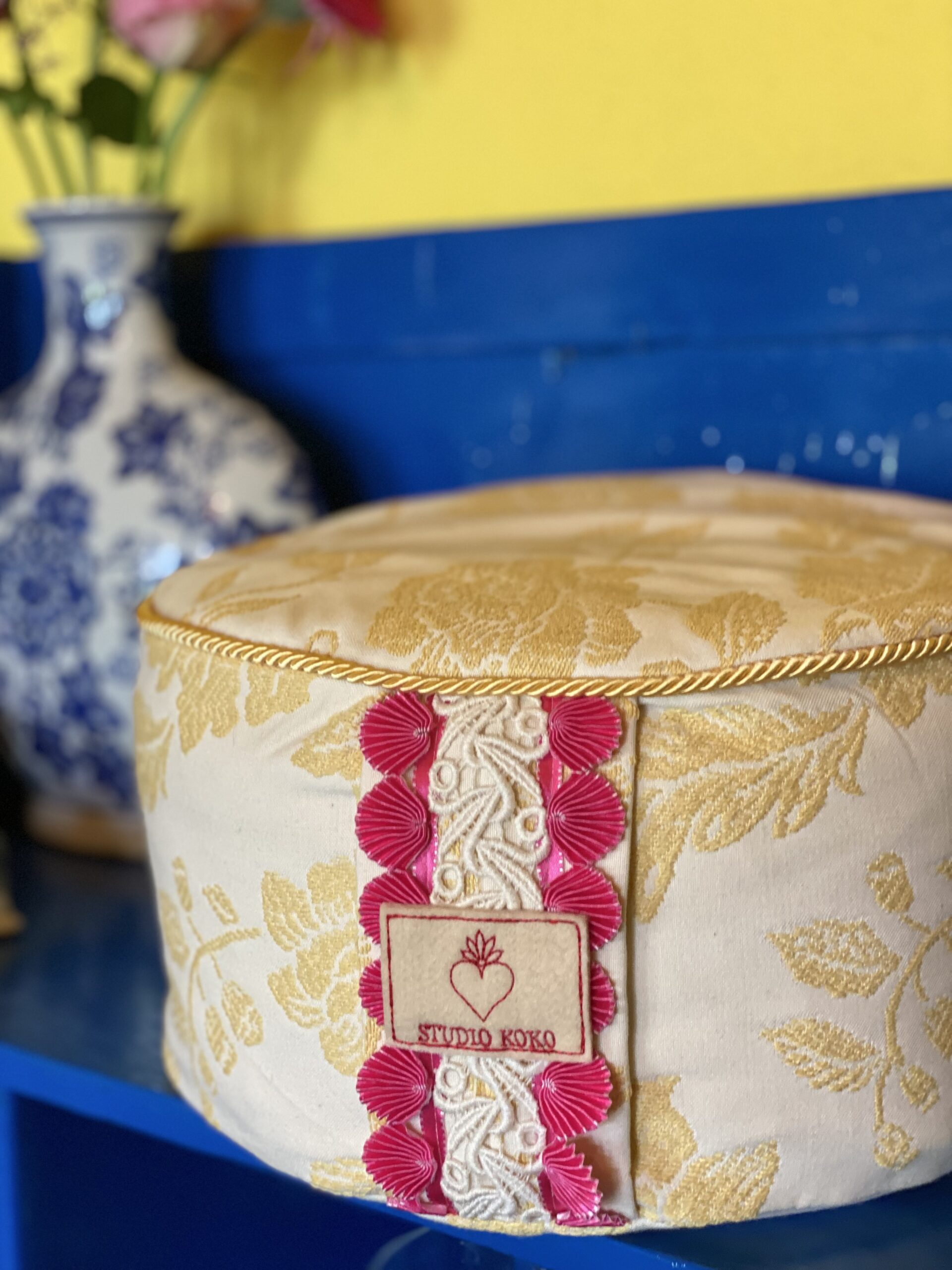 Alle kussens komen standaard met een binnenhoes, die te bereiken is via de rits aan de onderkant. Door het extra brede handvat neem je het kussen overal gemakkelijk mee naartoe. Niet alleen voor je yoga en meditatie practice kun je het kussen gebruiken, het staat ook nog eens mooi in je interieur! Handgemaakt in studio KOKO, een one-of-a-kind meditatiekussen van vintage materialen.